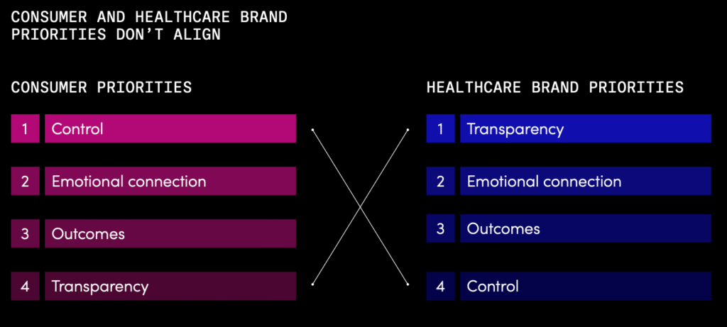 Healthcare brands are focused on providing transparency – making sure people understand how the technology is steering their experiences, and why. This is actually a relatively low priority for consumers. They place much more importance on being able to retain control and easily adjust or override an AI’s choices.