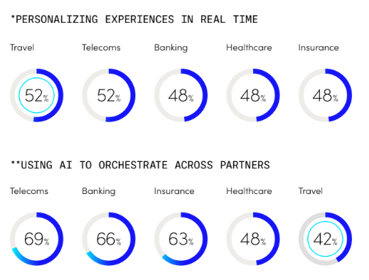 Another form of friction negatively impacting the customer journey is fragmentation: 73% of travel and hospitality customers say it’s frustrating to jump between apps or platforms just to achieve one thing. People also place the onus on brands to bridge the gap; three-quarters believe it’s a brand’s responsibility to make cross-platform journeys seamless, even when partners are involved. Despite this pressure, travel and hospitality is the industry least likely to use AI to orchestrate journeys across touchpoints or partners.